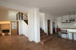 Husets nedre del består av ett stort rum med bra höjd över taket. Här finns ett modernt och funktionellt kök mot matsal och vardagsrum med utgång till en trevlig altan. På denna nivå finns också en lounge, en stor välvd källare och en separat toalett.