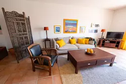 Den består av ett trevligt, ljust vardagsrum med matplats och öppet kök, som genom stora burspråk öppnar sig mot en terrass i söderläge med en härlig havsutsikt. Ett kontor/alkovutrymme med bäddsoffa och skrivbord kompletterar vardagsrummet.