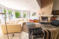 Till höger ligger det 45 m² stora vardagsrummet med matplats, som är uppbyggt kring en traditionell öppen spis; en mezzanin ger rummet en varm känsla.
